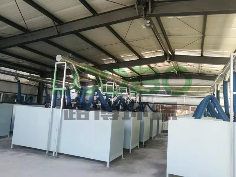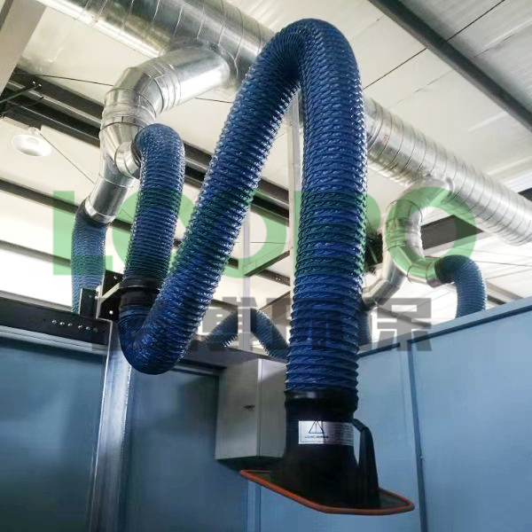 實(shí)訓(xùn)室排煙系統(tǒng)現(xiàn)場(chǎng)所需除塵的工位共包含20個(gè)焊接工位,每個(gè)工位煙塵收集采用一套2.5m長(zhǎng)萬(wàn)向吸氣臂的形式。吸氣臂規(guī)格:φ150mm*2500mm每條支管道配套一個(gè)手動(dòng)風(fēng)閥;