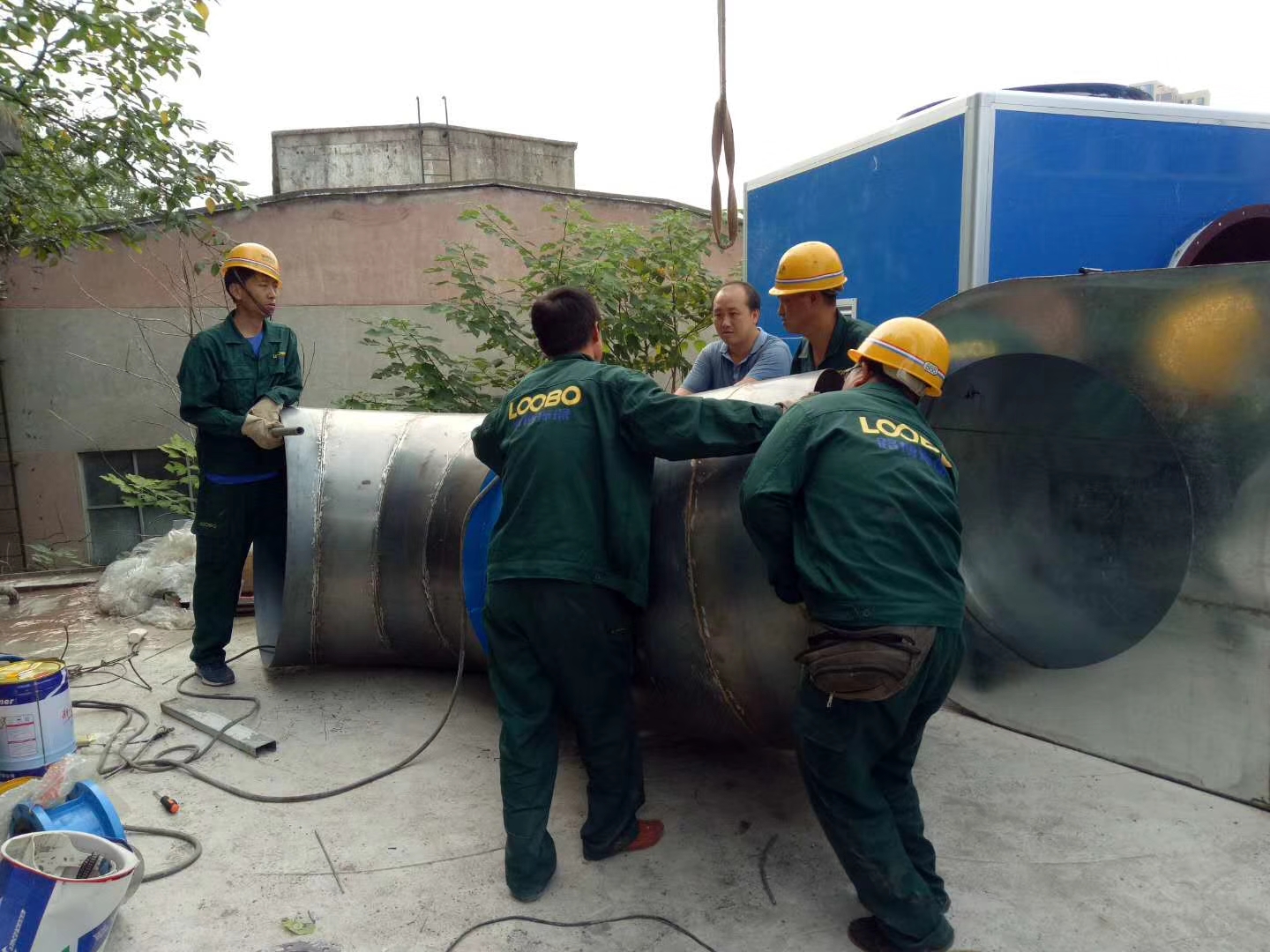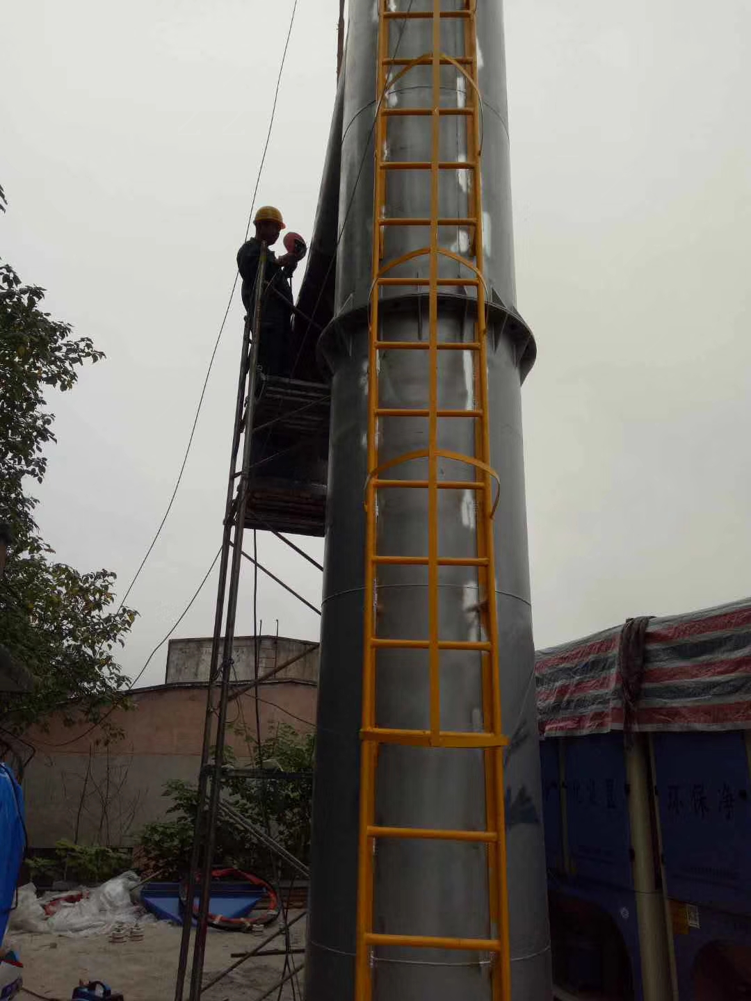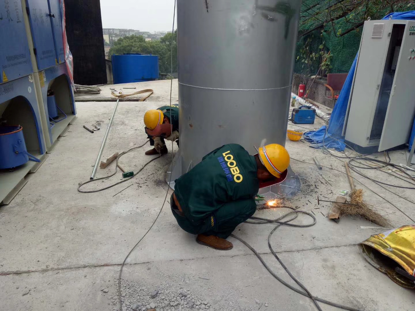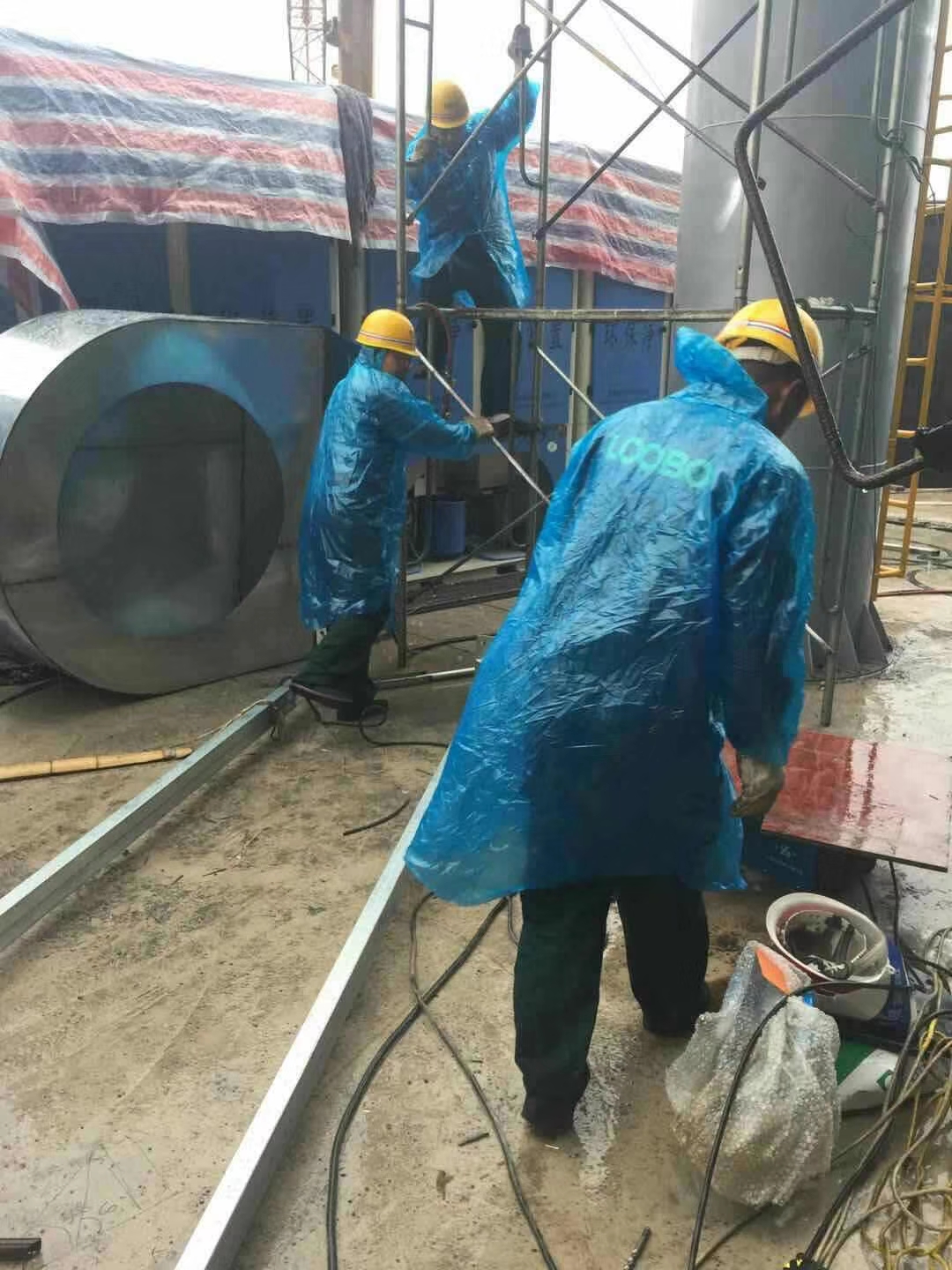 落砂房除塵項目施工前期,路博環(huán)保施工人員爭分奪秒,冒雨作業(yè)