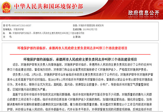 環保部刊發約談臨沂市長原文:《環境保護部約談臨沂、承德兩市人民政府主要負責同志并叫停三個違法建設項目》